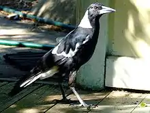 The bird was named for its similarity in colouration to the European magpie; it was a common practice for early settlers to name plants and animals after European counterparts.[10] However, the European magpie is a member of the Corvidae, while its Australian counterpart is placed in the family Artamidae (although both are members of a broad corvid lineage). The Australian magpie's affinities with butcherbirds and currawongs were recognised early on and the three genera were placed in the family Cracticidae in 1914 by John Albert Leach after he had studied their musculature.[18] American ornithologists Charles Sibley and Jon Ahlquist recognised the close relationship between woodswallows and the butcherbirds in 1985, and combined them into a Cracticini clade,[19] in the Artamidae.[20] The Australian magpie is placed in its own monotypic genus Gymnorhina which was introduced by the English zoologist George Robert Gray in 1840.[21][22] The name of the genus is from the Ancient Greek gumnos for "naked" or "bare" and rhis, rhinos "nostrils".[23] Some authorities such as Glen Storr in 1952 and Leslie Christidis and Walter Boles in their 2008 checklist, have placed the Australian magpie in the butcherbird genus Cracticus, arguing that its adaptation to ground-living is not enough to consider it a separate genus.[20][24] A molecular genetic study published in a 2013 showed that the Australian magpie is a sister taxon to the black butcherbird (Melloria quoyi) and that the two species are in turn sister to a clade that includes the other butcherbirds in the genus Cracticus. The ancestor to the two species is thought to have split from the other butcherbirds between 8.3 and 4.2 million years ago, during the late Miocene to early Pliocene, while the two species themselves diverged sometime during the Pliocene (5.8–3.0 million years ago).[25]