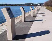 The "Australians of the Year Walk" in Canberra was designed by the National Capital Authority[34] and comprises a series of plinths, seats and lighting. Incorporated in the pathway are five metal strips set flush in the concrete, representing the five music stave lines. The plinths are placed in musical note position to the score of the national anthem "Advance Australia Fair". Fixed to each plinth is an anodised aluminium plaque containing the names and images of an Australian of the Year, there is one plaque for each year of the award. The plaques are arranged chronologically, starting at the western end of the path near Commonwealth Avenue Bridge. The lake side is bordered by white paving stones, the land side by a white paved walkway.