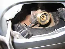 In most modern installations, an electronic device called a tachometric relay or safety switch is used to operate electrical shut-off solenoids. These work by sensing that the engine is running by detecting ignition pulses. Some systems use an engine oil pressure sensor instead. In all installations, there is a filterlock (consisting of a filter assembly and a vacuum or electric solenoid operated shut-off valve) located at the input to the converter. In European converters, there is also a solenoid in the converter to shut off the idle circuit. These valves are usually both connected to the output of the tachometric relay or oil pressure switch. Where solenoids are fitted to the outputs of fuel tanks, these are also connected to the output of the tachometric relay or oil pressure switch. In installations with multiple tanks, a switch or changeover relay may be fitted to allow the driver to select which tank to use fuel from. On bi-fuel, the switch used to change between fuels is used to turn off the tachometric relay.