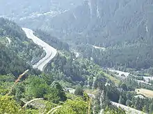 The Autostrada A32 near Beaulard. Down on the right the Turin–Modane railway and the Dora di Bardonecchia.