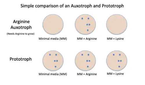 Prototrophic cells (also referred to as the 'wild type') are self sufficient producers of all required metabolites (e.g. amino acids, lipids, cofactors), while auxotrophs require to be on medium with the metabolite that they cannot produce.[1] For example saying a cell is methionine auxotrophic means that it would need to be on a medium containing methionine or else it would not be able to replicate. In this example this is because it is unable to produce its own methionine (methionine auxotroph). However, a prototroph or a methionine prototrophic cell would be able to function and replicate on a medium with or without methionine.[2]