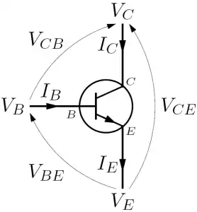 In this section, the static characteristic of an avalanche transistor is calculated. For the sake of simplicity, only an NPN device is considered: however, the same results are valid for PNP devices only changing signs to voltages and currents accordingly. The analysis closely follows that of William D. Roehr in (Roehr 1963). Since avalanche breakdown multiplication is present only across the collector-base junction, the first step of the calculation is to determine collector current as a sum of various component currents though the collector since only those fluxes of charge are subject to this phenomenon. Kirchhoff's current law applied to a bipolar junction transistor implies the following relation, always satisfied by the collector current