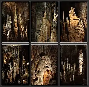 The Grand Salle is close to 100 metres (330 ft) long and 55 metres (180 ft) wide.[1] The floor is covered with a proliferation of fragile limestone speleothems in a variety of shapes and sizes, created by the slow dripping of water through the stone over thousands of years. Some have reached heights of close to 30 metres (98 ft).[1]