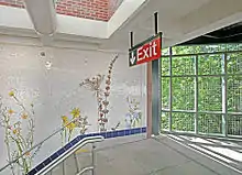 The 2011 artwork here is called Brooklyn Wildfires by Jason Middlebrook and Miotto Mosaic Art Studio. It is installed on the walls of the Coney Island-bound platform's staircase and consists ceramic tiling and glass mosaic depicting various species of wildflowers.
