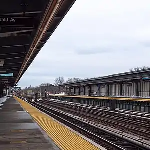 As part of Contract 4 of the Dual Contracts, between the city and the BRT, a three-track elevated railway was built above the surface Culver Line from the Fifth Avenue Elevated southeast and south to Coney Island.[3] The Culver Line was operated as a branch of the Fifth Avenue Elevated, with a free transfer at Ninth Avenue to the West End Line into the Fourth Avenue Subway.[4][5][6][7] Avenue X station opened as the line was extended from Kings Highway at noon on May 10, 1919.[8][9][10]