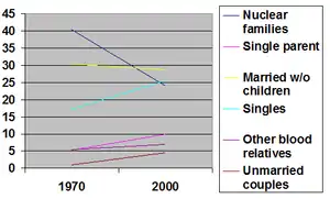 By 2000 the percentage of nuclear families had decreased by 40%, while the number of other family types had increased by 51%. The percentage of single households has also steadily increased. In 1970, only 17% of households consisted of singles. In 2000 that figure had increased by 50% with singles constituting 25.5% of households. The most drastic increase was among the percentage of households made up of single males, which nearly doubled from 5.6% in 1970 to 10.7% in 2000.[1]