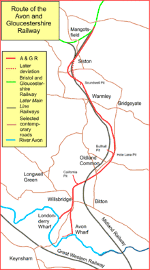 The A&GR would run from a junction with the B&GlosR line at Mangotsfield (close to the site of the later Mangotsfield North Junction on the later main line railway) and follow a southerly course to the River Avon. Any coal from Coalpit Heath for the A&GR line would therefore travel over the B&GlosR line as far as the junction.
