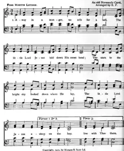 The most popular musical setting in the United States is commonly known as "Mueller".[1] The melody was first published, under the title "Luther's Cradle Hymn", by James R. Murray in his collection Dainty Songs for Little Lads and Lasses (1887).[6][1]