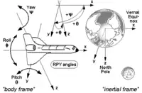 - Finally, in case of space vehicles like space shuttles etc., a modification of the latter convention is used, where the vehicle's (body's) positive y- or pitch axis again always points to its right, and its positive z- or yaw axis always points down, but “down” now may have two different meanings: If a so-called local frame is used as external reference, its positive z-axis points “down” to the center of the earth as it does in case of the earlier mentioned NED-system,[4] but if the inertial frame is used as reference, its positive z-axis will point now to the North Celestial Pole, and its positive x-axis to the Vernal Equinox[5] or some other reference meridian.