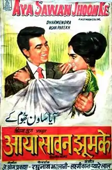 Aya Sawan Jhoom Ke (transl. The monsoon came dancing) is a 1969 film directed by Raghunath Jhalani. It became a box office hit.[1] The film stars Dharmendra, Asha Parekh, Nazir Hussain, Nirupa Roy, Bindu, Aruna Irani, and Rajindernath. The music is by Laxmikant Pyarelal and the lyrics by Anand Bakshi. The songs were meaningful and also melodious. # 8 at Box-Office Collection list.[2]