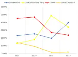 The newly formed Ayr, Carrick and Cumnock constituency was won by Labour's Sandra Osborne at the 2005 general election with a majority of 9,997 votes (22.2%) ahead of the Conservatives. This was reduced slightly to 9,911 votes (21.6%) in 2010, before the constituency fell to the SNP at the 2015 SNP landslide, with SNP candidate Corri Wilson overturning incumbent Labour MP Sandra Osborne's 13,356 vote lead over the SNP (29.1%), securing the constituency with a majority of 11,265 votes (21.6%). Bill Grant of the Conservatives gained the seat at the 2017 snap general election with a majority of 2,774 votes (6.0%) over Corri Wilson of the SNP. In the 2019 General Election, Allan Dorans of the SNP gained the seat from the Conservatives to take the seat again for a second time
