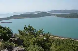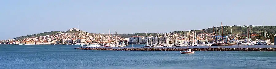 ![]() A view of the Çamlık area of Ayvalık and the Ayvalık Islands archipelago in the Aegean Sea, with the Greek island of Lesbos on the horizon, at left. | |