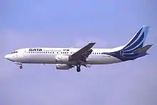 The airline was first established in March 1994 under the name of OceanAir and in 1995 was authorized to operate air transport services as a non-scheduled carrier. SATA Air Açores became the major shareholder when OceanAir suspended service in 1994. It later became the sole owner, and on 20 February 1998 it was re-branded as SATA Internacional, resuming operations on 8 April 1998. The airline's original livery consisted of an all white fuselage with the name SATA Internacional in ocean blue over the front windows, and a dark blue tail with the company logo.[4] Before this the livery had an idealised logo featuring the bands of crashing waves, superimposed by a sun-disk, with the calligraphic lettering "Fly Azores" below. This tourist-friendly logo was retired at the end of the 20th century, to be replaced with a more corporate image. The airline became a wholly owned subsidiary of Grupo SATA (the parent company).