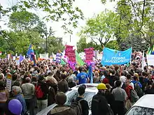 In 2005, the Mayor of Warsaw, Lech Kaczyński (later President of Poland), refused to allow a gay pride parade to take place through the city, justifying his decision by the fact that the organisers had not submitted a traffic organisation plan, that such a parade would promote a "homosexual lifestyle" in Warsaw, and that he is against "propagating gay orientation".[1] Despite this, on 11 June 2005, approximately 2500 people marched, in defiance of the ban.[2]