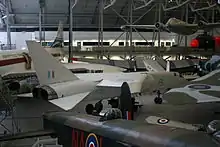 Work on GOR.339 continued, with a deadline for submissions on 31 January 1958. Many proposals were entered; English Electric teamed up with Short Brothers and submitted its P.17A along with the Shorts' P.17D, a vertical-lift platform that would give the P.17 a VTOL capability; designs were also received from Avro, Blackburn (the NA.39), de Havilland, Fairey, Hawker and Vickers-Armstrongs.[32] The Air Ministry eventually selected the EE P.17A and the Vickers-Armstrongs Type 571 for further consideration. The Ministry was particularly impressed with the Vickers submission, which included not only the aircraft design, but a "total systems concept" outlining all the avionics, support facilities and logistics needed to maintain the aircraft in the field. Official opinions of English Electric's management found it decidedly lacking in comparison to Vickers, but the combination of the two was felt by officialdom to be a useful marriage and accordingly the development contract was awarded to Vickers, with English Electric as sub-contractor.[33][34]