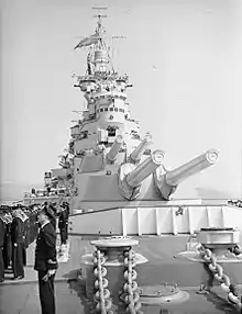 All shipboard mounts of the gun were in twin turrets. Excepting on the battlecruiser HMS Hood, all mountings were designated Mk I, with an as-built maximum elevation of 20°, though some were subject to later modifications. HMS Hood had its guns in a unique mounting, designated Mk II. Incorporating experience from the Battle of Jutland, the Mk II mounting had a maximum elevation of 30°, thus increasing the maximum range.[7] In the 1930s a modification of the Mk I mounting, designated the Mk I (N), was introduced for use in those capital ships that were completely reconstructed. The Mk I (N) mounting also increased the maximum elevation from 20° to 30°.[8] Maximum range in shipboard mountings was 33,550 yards (30,680 m) (30° elevation).[2] During World War II unreconstructed older battleships, with gun elevation limited to 20°, were supplied with supercharges to increase their maximum range to 29,930 yards (27,370 m) at 2638 ft/s (804 m/s) using the Mk XVIIB or Mk XXII projectile, while HMS Vanguard could theoretically range to 37,870 yards (34,630 m) while using supercharges at a gun elevation of 30°.[2] Coastal artillery mountings with higher elevations could reach 44,150 yards (40,370 m). The Mk I mounting had a revolving weight of 750 tons (1915) and 785 tons (1935). The Mk I (N) had a revolving weight of 815 tons; the Mk I (N) RP12 mounts of HMS Vanguard had a revolving weight of 855 tons. The Mk II mounts of HMS Hood had a revolving weight of 860 tons.[9]