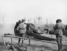 A gun not on Vickers platform, has scotches behind wheels to steady it