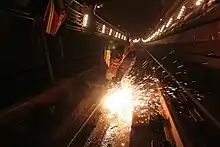 On September 30, 1990, express service on the Broadway Line was restored when repair work on the Manhattan Bridge was temporarily suspended. The N then began making express stops from 34th Street to Canal Street at all times except late nights. R service between Manhattan and Brooklyn was increased during rush hours. During late nights, R trains no longer ran via the Broadway Line; instead, they operated as a shuttle in Brooklyn, terminating at 36th Street.[36][39] The brief Broadway service via the Manhattan Bridge was stopped on December 27 because of a cracked beam on the bridge.[40][41][42]