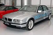 On May 11, 2000, BMW presented a fleet of fifteen 750hL's in Berlin.[48] Its twelve-cylinder hydrogen combustion engine can be operated on both hydrogen and petrol. In operation on hydrogen, it delivers 150 kW (201 hp), accelerating from 0 to 100 km/h (62 mph) in 9.6 seconds and slowing the car to attain a top speed of 226 km/h (140 mph).[49]