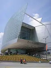Tulsa city officials asked César Pelli to create an arena that would be an architectural icon.[12][13] To achieve this, Pelli employed cultural and architectural themes of the city, including Native American, art deco, and contemporary styles.[14] He made heavy use of swirling circular elements in the exterior and interior designs of the building.[15] A 103-foot (31 m), 600-foot (180 m) long glass facade featuring 1,600 350-pound (160 kg) panels wrap around the building in an escalating motion leaning at a five-degree angle. 33,000 stainless steel panels produced and installed by Zahner continue the upward spiraling path around the circumference of the structure.[16][17] The interior follows the motion, with grand staircases that wrap around a portion of the building from the main lobby. In total, the building's design required 350,000 square feet (33,000 m2) of exterior stainless steel panels, 75,000 square feet (7,000 m2) of glass, 30,000 cubic yards (23,000 m3) of concrete, and 4,000 tons of structural steel.[1]