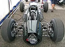 BRM had some previous experience of stressed skin construction with the BRM P25, so Rudd was in a good position to be able to exploit the new technology to the full. This previous experience meant that Rudd's use of the monocoque was somewhat different from the pioneering Lotus's frame. Where the 25 had been a channel-section frame with an open top, within which the driver sat, the P261 chassis was a slim tubular-section, into which a hole was cut to allow the driver to gain access.[3] To replace the P61's subframe the side pontoons of the P261 chassis were extended behind the driver's seat, and the engine was mounted between them. Within the pontoons, rubber cells were used to retain fuel. This caused complications early in the P261's life, as BRM's new, high-exhaust version of the P56 V8 engine was not ready for the start of the 1964 season, and holes had to be cut in the pontoons to allow the exhaust pipes of the older, low-exhaust version to pass through them.[3] The centre exhaust engine appeared at the 1964 Italian Grand Prix in Graham Hill's new chassis "2616" and this and "2617", which was Jackie Stewart's regular car in 1965, were the only two P261s which did not have the exhaust slots. These were plated over on the earlier cars which remained in service, but could be opened up if necessary to fit outside exhaust engines, as happened in the 1967 Tasman Championship.