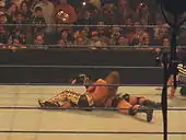 The primary feud on the ECW brand was between Kane and Chavo Guerrero, with the two battling over the ECW Championship. Before WrestleMania XXIV aired live on pay-per-view, Kane won a 24-Man Battle Royal to earn an ECW Championship match against Chavo Guerrero later that night.[9] Kane would go on to defeat Guerrero and become the new ECW Champion.[9] On the April 4 episode of SmackDown!, SmackDown! General Manager Vickie Guerrero booked Kane to defend the ECW Championship against Chavo Guerrero at Backlash.[8] The feud intensified on the April 8 episode of ECW, where during a contract signing for Backlash, Guerrero, with assistance from Bam Neeley, Curt Hawkins and Zack Ryder, delivered a Frog splash on Kane through a table.[10] Two weeks later on April 22, 2008, the feud again intensified during an episode of the Cutting Edge, in which Edge, Hawkins, Ryder, and Neeley ganged up against Kane. The gang-up allowed Guerrero to attack Kane with a steel chair.[11]
