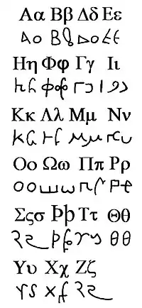 ![]() The Bactrian alphabet (block and cursive letters). Bactrian was written using most of the letters of the Greek script with the addition of the letter sho ( | |