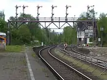 At the beginning of the 20th century, there was a major renovation of the station. This was precipitated by the construction of the branch line to Oker, which was completed in 1912. The second track was installed on the line to Vienenburg in 1907.[14] The passenger station was equipped with three terminal platforms, which were connected to the new station building in 1905. The two smaller turntables were abandoned and replaced by a 20-metre turntable in the locomotive depot. These were now served by two connections between the platforms, which were controlled by hand-operated sets of points. The locomotive depot was also expanded. The signal box and the depot located at the freight yard were replaced by the KED Magdeburg with a new mechanical interlocking at its north end in the same year. Its notable feature is the signal gantry, which still stands.[12] The turntable was enlarged to a diameter of 23.6 metres in the 1920s. At about the same time, canopies were installed on platforms B and C.[4]