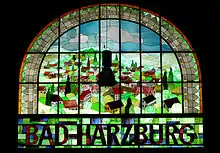 In 1942, Deutsche Reichsbahn rebuilt the second track from Vienenburg.[15] The station was long spared from military action during the Second World War. At that time, Deutsche Reichsbahn preferred to use the connection from Heudeber-Danstedt to Goslar via Wernigerode and Bad Harzburg for diverted traffic. The foothills of the low mountain range were expected to provide sufficient protection against air raids, which did not prove true at the end of the war. US soldiers reached Goslar on 10 April 1945 and a day later Bad Harzburg was freed.[16] At the same time, the Stapelburg air munitions plant, which was six kilometres away, blew up after an air raid. The blast of the detonation was so strong that the east window at Harzburg station was broken. It was restored in 1986 to almost original condition.[4]