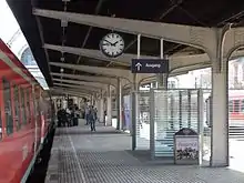 The six main platform tracks of the station (tracks 1–6) are located on the southwest side at three island platforms; track 1 is out of use. The platform of tracks 1/2 is not covered and the platforms of tracks 3–6 are partially covered, but there is no train shed. The platforms are connected by a concourse at the southeast end, this is bordered by the entrance building opened in 1905. Its facade is built in the Renaissance Revival style and its interior in the Jugendstil (art nouveau). The freight yard is located to the east of the passenger station. Since the last reconstruction in 2003, this has had four loading tracks (tracks 10–13).[4]