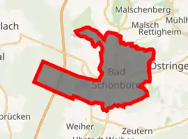 In 1971, two previous towns Bad Langenbrücken and Bad Mingolsheim were combined, and the town was named Bad Schönborn after Damian Hugo von Schönborn, archbishop of Speyer (1719–1743), who built Kislau Castle in Bad Mingolsheim.[2]