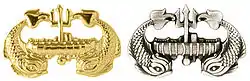 Submarine Qualification insignia (usually known as "dolphins" or "fish") are breast insignia of the submarine warfare community which are issued to those naval personnel after they complete a complex, demanding and extensive program that incorporates learning each system aboard the submarine and completion of certain watchstanding requirements including cross rate watch requirements. This program differs from many of the other "Warfare" programs in that it requires personnel to become proficient in engineering and operational details to such an extent that each person must be able to understand and perform basic operation of each system and equipment aboard the submarine. In addition each person must be able to efficiently perform damage control and emergency control functions in each space on the submarine. The Submarine Qualification insignia for officers and enlisted was first proposed by then-Captain Ernest King on June 13, 1923, with the current design finalized March 1924.