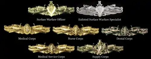 Line officers of the surface warfare community earn the Surface Warfare Officer (SWO) insignia. Enlisted personnel who complete the Enlisted Surface Warfare qualification program earn the Enlisted Surface Warfare Specialist (ESWS) insignia. Other insignia for qualification in specialized areas exist in the Medical Corps, Nurse Corps, Dental Corps, Medical Service Corps,[16] and Supply Corps.