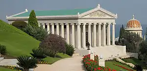 The International Archives, designed by Mason Remey,[6] is the first building to be built on the Arc and holds many of the most sacred items within the Baháʼí Faith,[7] but most importantly is built for the viewing of the paintings and drawings of Baháʼu'lláh and the Báb, along with a single photograph of Baháʼu'lláh. Although some of these items are available on the internet today, most Baháʼís prefer to see these items only in a reverent atmosphere, during the pilgrimage.