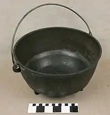 A bail handle, or simply bail, is a handle that consists of an open loop that moves freely within two fixed mounts or ears. Several designs are available: bails are typically made of metal (wire) or plastic.[1][2][3][4] It is a type of package handle which may be used for carrying an item, such as a tin can or bucket; or kettle, or as a drawer pull. A bail handle can also be used to hang an item such as a pharmaceutical bottle[5][6] potted plants, etc.
