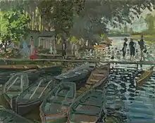 Bain à la Grenouillère is an 1869 painting by the French impressionist painter, Claude Monet. (Oil on canvas, 74.6 cm x 99.7 cm). It depicts "Flowerpot Island", also known as the Camembert, and the gangplank to La Grenouillère, a floating restaurant and boat-hire on the Seine at Croissy-sur-Seine. He was accompanied by Pierre-Auguste Renoir, who also painted the scene at the same time.