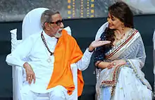 Thackeray is satirised in Salman Rushdie's 1995 novel The Moor's Last Sigh as 'Raman Fielding'. The book was banned by the Maharashtra state government.[93] Suketu Mehta interviewed Thackeray in his critically acclaimed, Pulitzer-nominated, non-fiction 2004 book Maximum City. Thackeray previewed director Ram Gopal Verma's film Sarkar, which is loosely based on him, released in 2005.[13] The 2011 documentary Jai Bhim Comrade depicted a speech by Thackeray at a public rally, in which he articulated "genocidal sentiments" about Muslims, stating that they were the "species to be exterminated." The documentary followed this by showing several Dalit leaders criticising Thackeray for his beliefs.[94]