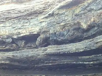 Ball-and-pillow structures are masses of clastic sediment that take the form of isolated pillows or protruding ball structures. These soft-sediment deformations are usually found at the base of sandstone beds that are interbedded with mudstone.[1] It is also possible to find ball-and-pillows in limestone beds that overlie shale, but it's less common.[2] They are normally hemispherical or kidney shaped, and range in size from a few inches to several feet.