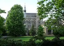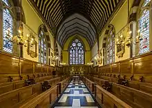 The college's dining hall was built in 1877, replacing an older hall in the front quadrangle, which had become too small for the college's population.[36] Designed by Alfred Waterhouse,[37] the hall is built in geometric style, using Bath stone and Tisbury stone, with roof and woodwork made of oak.[36] The hall features a Willis organ, again instituted by Benjamin Jowett.[38] The old hall became part of the library.[39]