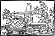 A four-wheeled carroballista drawn by armored horses, from an engraving illustrating a 1552 edition of the war-machine catalog De Rebus Bellicis (c.400)