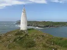 The conspicuous conical white painted Baltimore Beacon, sometimes called the 'pillar of salt' or 'Lot's wife' is approximately 50 feet (15.2m) high and 5 yards (4.6m) in diameter at the base. The vent, mentioned by Halpin in 1849 was obviously vulnerable and at a later date was replaced by a sphere.