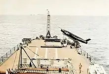 At full speed, Vought OS2U Kingfisher could be launched from these catapults and later Curtiss SC-1 Seahawk as well. These planes were used for reconnaissance, anti-submarine, and rescue missions. The planes were seaplanes, and after their missions would land in the water near the cruiser and be lifted back up into the ship by the crane or cranes in the rear and reset upon their catapults. In the 1950s, the catapults and the accompanying capacity to launch airplanes were removed, though the cranes were left and the hangars used to house helicopters, ship's boats or the workings of the Regulus missile system.