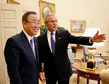 During the period in which these polls took place, Ban made major speeches to the Asia Society and the Council on Foreign Relations in New York City.[40][41] To be confirmed, Ban needed not only to win the support of the diplomatic community, but also to be able to avoid a veto from any of the five permanent members of the council: People's Republic of China, France, Russia, the United Kingdom, and the United States. Ban was popular in Washington for having pushed to send South Korean troops to Iraq, and had the support of the Bush administration as he pursued the position.[42] But Ban also opposed several U.S. positions: he expressed his support for the International Criminal Court and favoured an entirely non-confrontational approach to dealing with North Korea.[17] Ban said during his campaign that he would like to visit North Korea in person to meet with Kim Jong-il directly.[32] Ban was viewed as a stark contrast from Kofi Annan, who was considered charismatic, but perceived as a weak manager because of problems surrounding the UN's oil-for-food program in Iraq.[43]