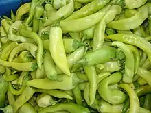 A mature fruit will be about 2–3 inches (5–8 cm) in length and have a curved shape and yellowish color similar to a banana, giving rise to the fruit's common name. Friggitelli (pepperoncini) are often erroneously referred to as banana peppers.[2] The hot varieties of banana pepper are called Hungarian wax peppers.[3]