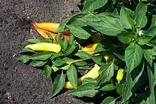 The banana pepper (also known as the yellow wax pepper or banana chili) is a medium-sized member of the chili pepper family that has a mild, tangy taste. While typically bright yellow, it is possible for them to change to green, red, or orange as they ripen.[1] It is often pickled, stuffed or used as a raw ingredient in foods. It is a cultivar of the species Capsicum annuum. Its flavor is not very hot (0–500 Scoville units) and, as is the case with most peppers, its heat depends on the maturity of the pepper, with the ripest being sweeter than younger ones.
