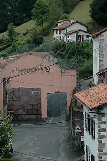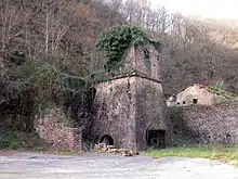 [19] These remains are at the northern entrance of the village including a blast furnace. The supply canal is fed by the waters of the Nive captured upstream and turn a wheel of a blower machine which injected air at the base of the blast furnace through two nozzles. The adjacent building, still dominated by the canal, housed the forge fires and hammers to make cast iron and a splitting mill for splitting iron bars. - Houses and Farms (19th century)