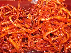 - Ojingeochae bokkeum (오징어채볶음) — Stir-fried dried shredded squid seasoned with a mixture of gochujang (chili pepper paste), garlic, and mullyeot (syrup-like condiment).[24]