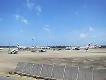 - Apron Charlie: It has 8 parking bays, all of them are currently remote bays. It can handle any 8 wide-body such as an Airbus A330, Airbus A340, Boeing 777 or Boeing 747 at once. The remote bays will be converted into 8 Airbus A380 capable boarding bridges under the Stage II development project. It is the only apron that is currently capable handling the Airbus A380-800. It has been used by Emirates Airbus A380s thrice.