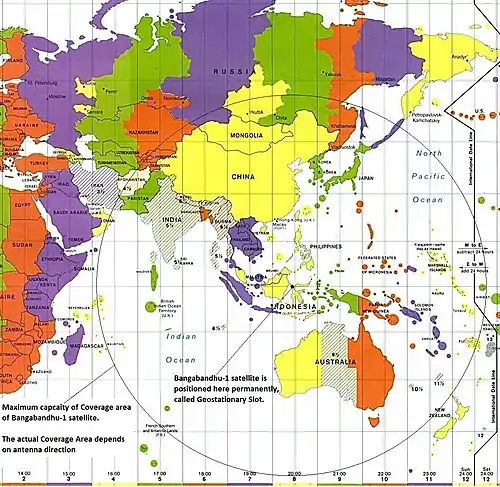 The satellite will expand Ku-band coverage over all of Bangladesh and its nearby waters including the Bay of Bengal, Nepal, Bhutan, Sri Lanka, the Philippines, eastern Indian states (West Bengal, Assam, Meghalaya, Mizoram, Tripura, Nagaland, Arunachal Pradesh) and Indonesia. This is coupled with C-band coverage for all aforementioned areas. It will be able to count holdings as well as to measure population density, depending on the natural increase and the natural decrease of birth rates and death rates in a particular country. It scans the number of people per 1,000 km2 with its advanced, installed technology such as cameras.