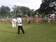After the establishment University of Dhaka (1921) the Corps initiated its activities under the provisions of the Indian Territorial Forces Act, 1923. Captain E. Groom was the first adjutant of the Corps. He imparted military training to 100 students and 16 teachers in November 1927. Later University Training Corps was officially founded in June 1928. In 1943, the name of the Corps was changed to University Officers Training Corps (UOTC). The members of this Corps took part in the liberation war of Bangladesh in 1971.[3] After independence, Bangladesh Cadet Corps comprising college students, and Junior Cadet Corps comprising junior students, were formed in addition to University Officers Training Corps. On 23 March 1979, University Officers Training Corps, Bangladesh Cadet Corps and Junior Cadet Corps were all merged by President Ziaur Rahman.[3] The organization is tri service combined from Bangladesh Army, Navy and Air Force.[4] At present, its headquarters is located in Sector 6, Uttara, Dhaka. There are three type of Cadets in BNCC and divided under two broad heads namely, Senior Division and Junior Division cadets. Senior division again has two categories of female and male cadets of various levels of education. The Bangladesh Government Cabinet approved a proposal to bring BNCC under a legal framework and department.[5] The proposal was titled Bangladesh National Cadet Corps Act-2015.[6] The separate department would be under the Ministry of Defense.[7] BNCC sent an delegation to India in a youth exchange program upon the invitation of the Indian Government[8] and participated in Republic Day Camp 2009.[9] The organization participates in Victory day parade.[10][11]